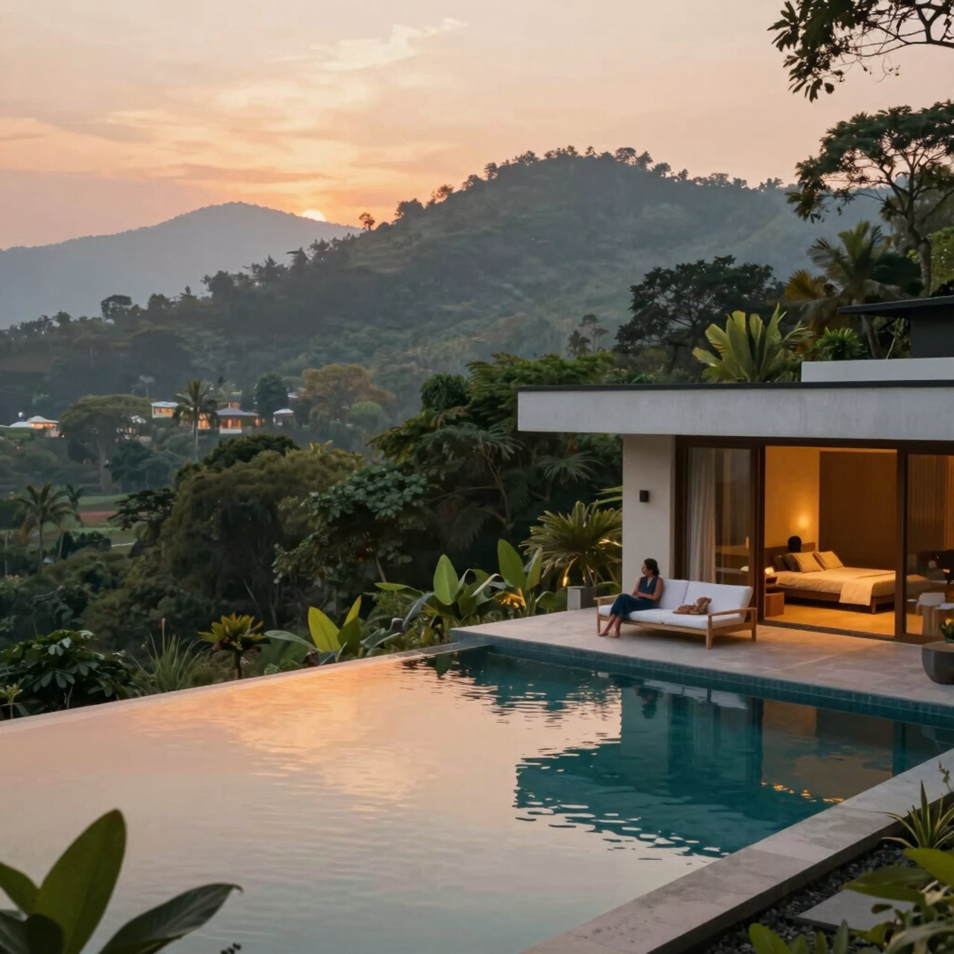 A cozy villa surrounded by lush greenery with a welcoming porch and warm sunset lighting.